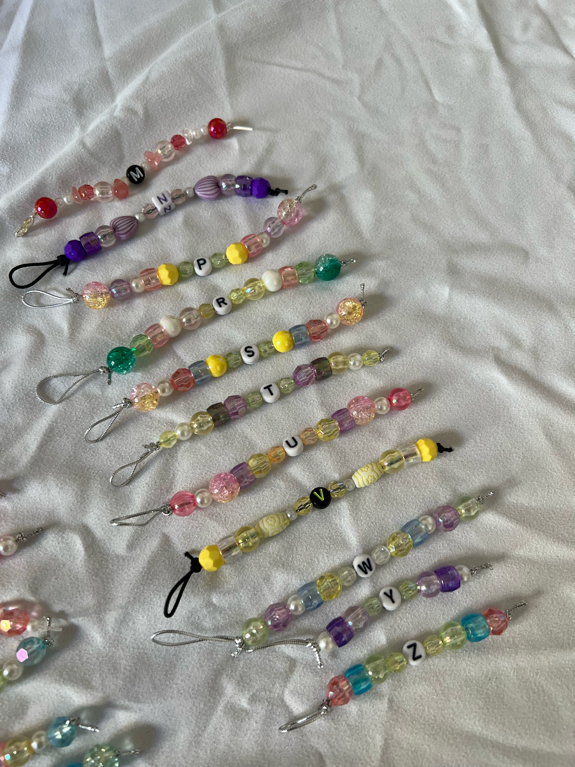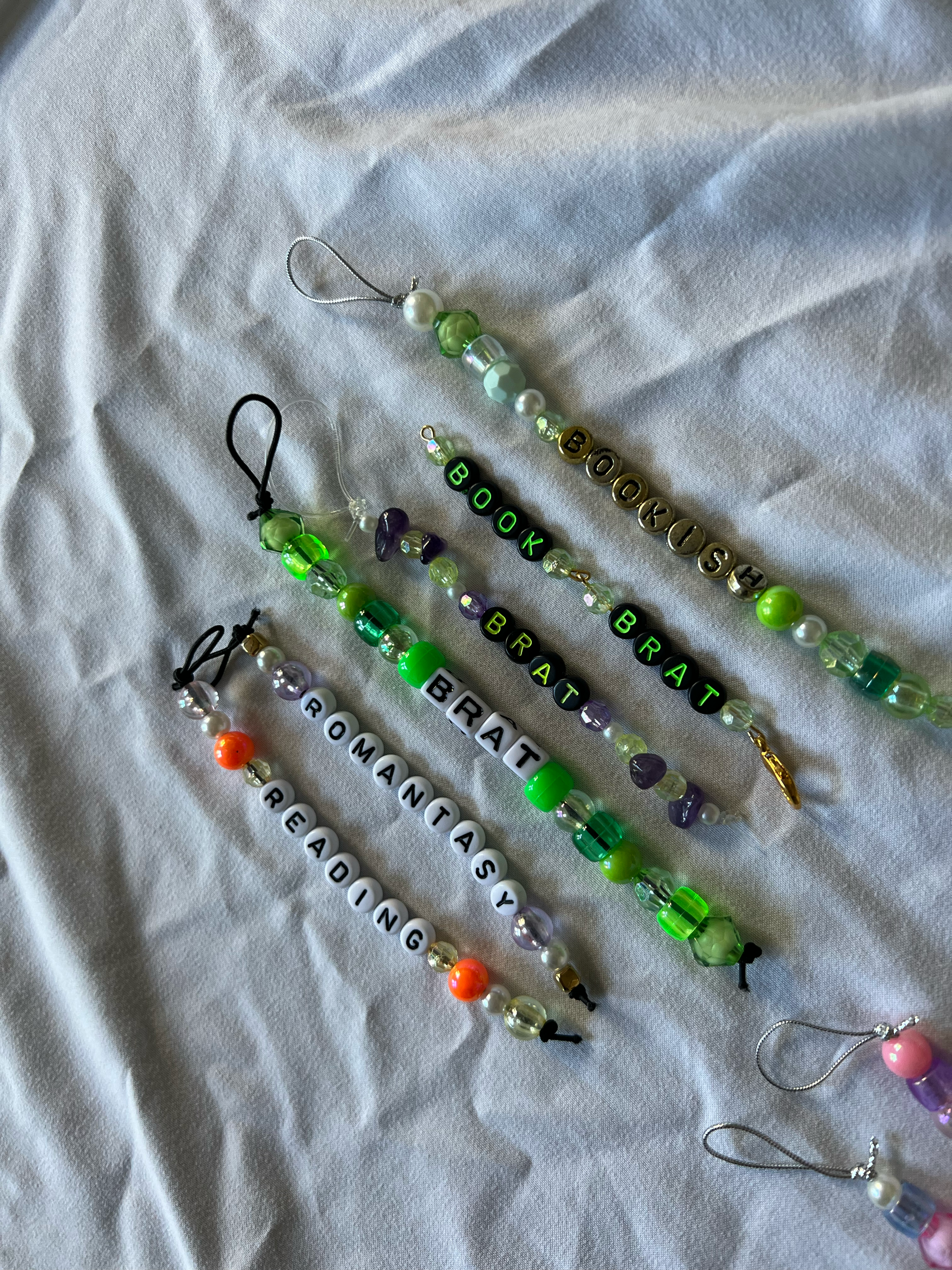 A bundle of 3 delightful handmade bag charms. You can sport them on one of our bookish totes or your own handbag. Bundle includes: 1 plain beaded thread, 1 beaded thread with an initial, and 1 beaded thread with a bookish word.